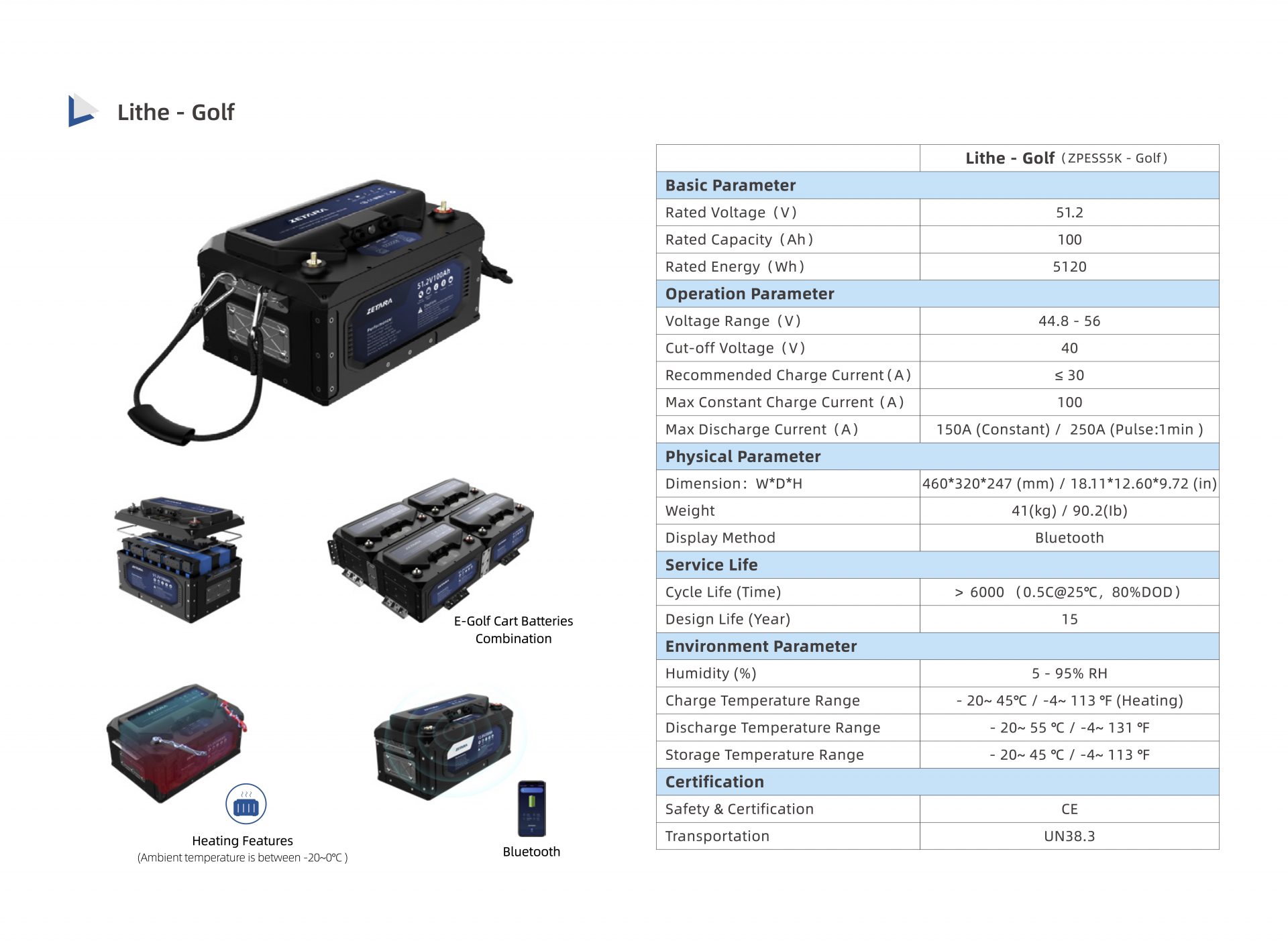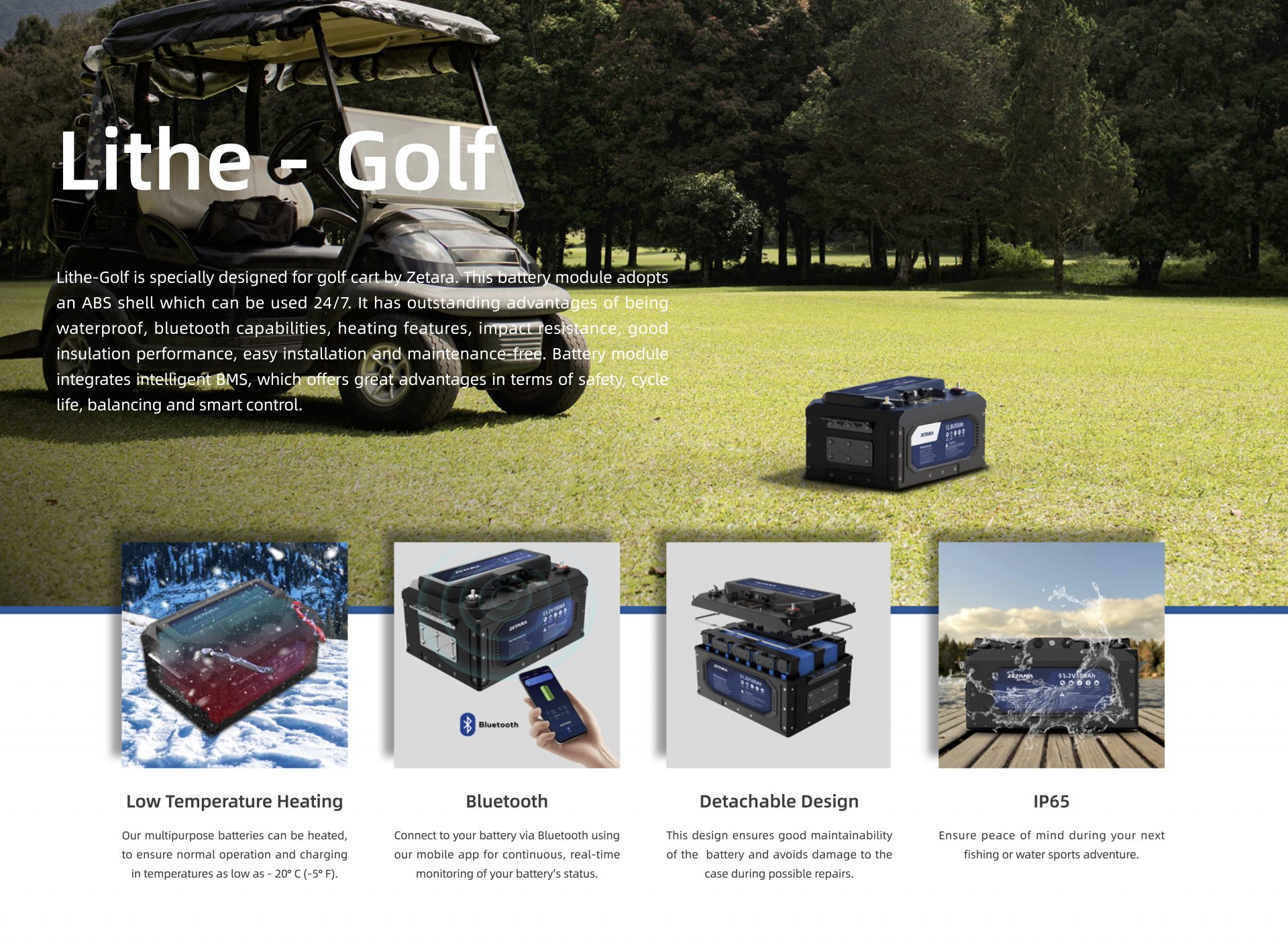 Der Lithe-Golf von Zetara wurde speziell für Golfwagen entwickelt. Dieses Batteriemodul verfügt über ein robustes ABS-Gehäuse und ist somit für den Dauerbetrieb geeignet. Es bietet herausragende Vorteile wie Wasserdichtigkeit, Bluetooth-Konnektivität, Heizfunktion, Stoßfestigkeit, hervorragende Isolationsleistung, einfache Installation und wartungsfreien Betrieb. Das integrierte intelligente BMS verbessert Sicherheit, Lebensdauer, Zellausgleich und intelligente Steuerung und sorgt so für zuverlässige und effiziente Leistung.