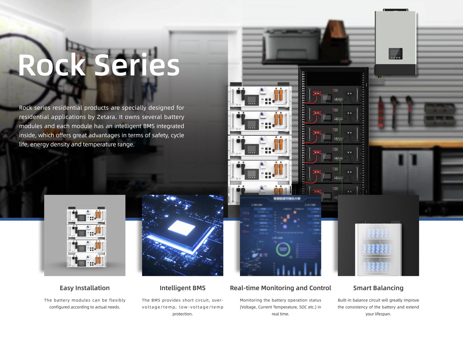 Die Produktfamilie der Energiespeicherlösungen für den Wohnbereich umfasst rackmontierbare, vertikal stapelbare, horizontal stapelbare und wandmontierbare Batteriesysteme. Jede Ausführung enthält mehrere Batteriemodule, wobei jedes Modul ein intelligentes BMS integriert hat, das große Vorteile in Bezug auf Sicherheit, Lebensdauer, Energiedichte und Temperaturbereich bietet.