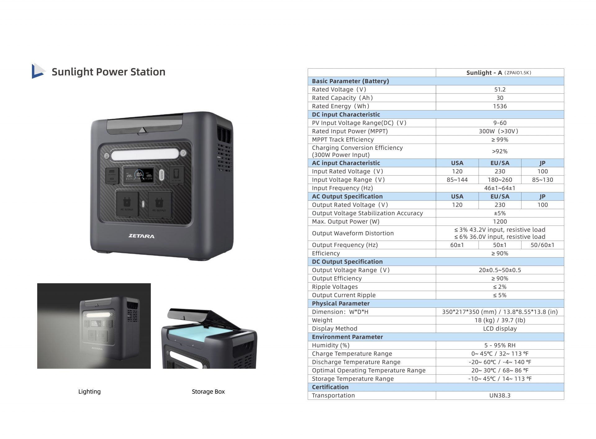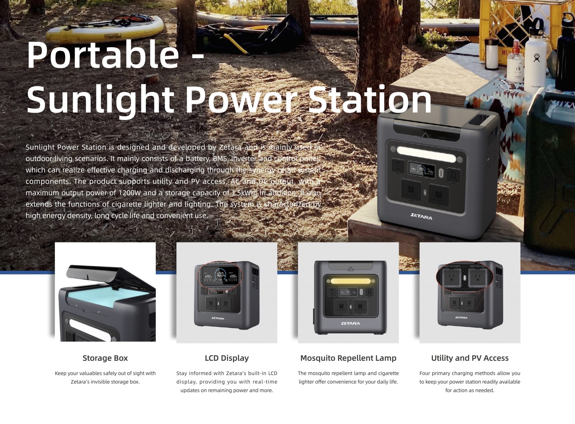 Zetara bietet ein tragbares Kraftwerk mit 1,2 kW/1,5 kWh und wird hauptsächlich im Außenbereich eingesetzt.